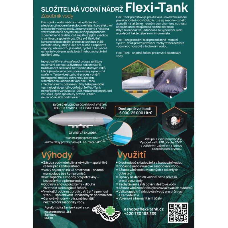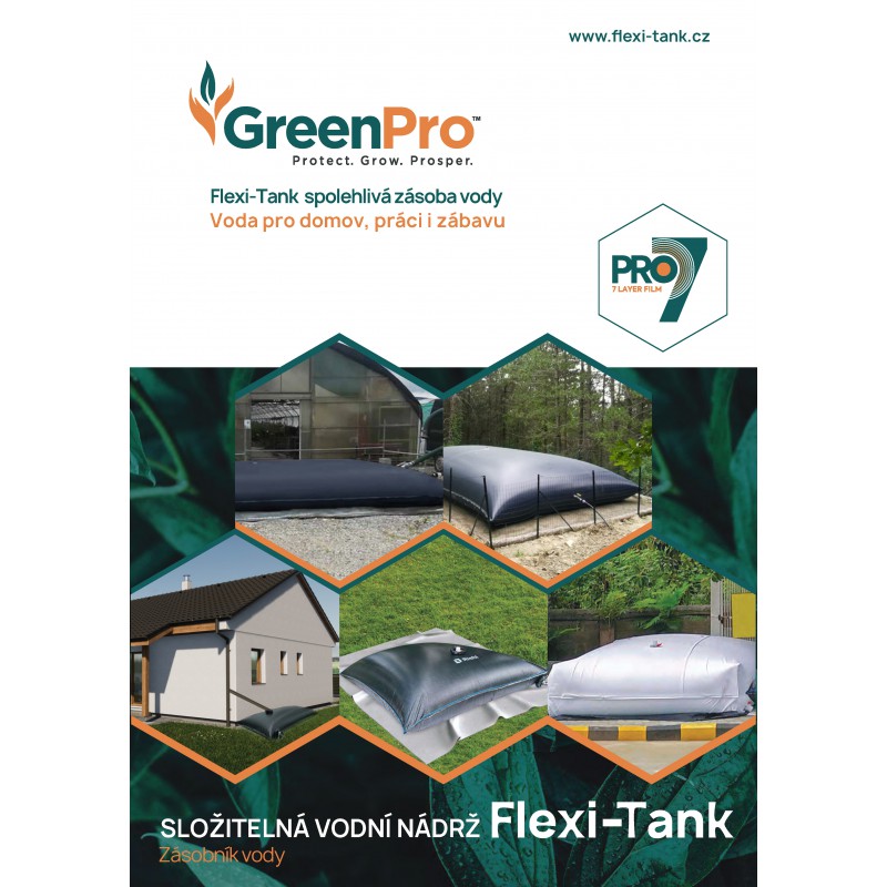 Flexi-Tank vodní nádrže značky GreenPro představují moderní a ekologické řešení pro efektivní skladování vody kdekoliv. Jsou vyrobeny z několika vrstev odolného polyetylenu s vnějším potahem z pevné tkané textilie, což zajišťuje jejich vysokou trvanlivost a spolehlivost. Díky své flexibilní konstrukci jsou ideální pro oblastech bez stálé infrastruktury, stejně jako pro suché a kopcovité regiony, kde umožňují snadné, rychlé a bezpečné uchování vody pro zavlažování nebo zachytávání dešťové vody.