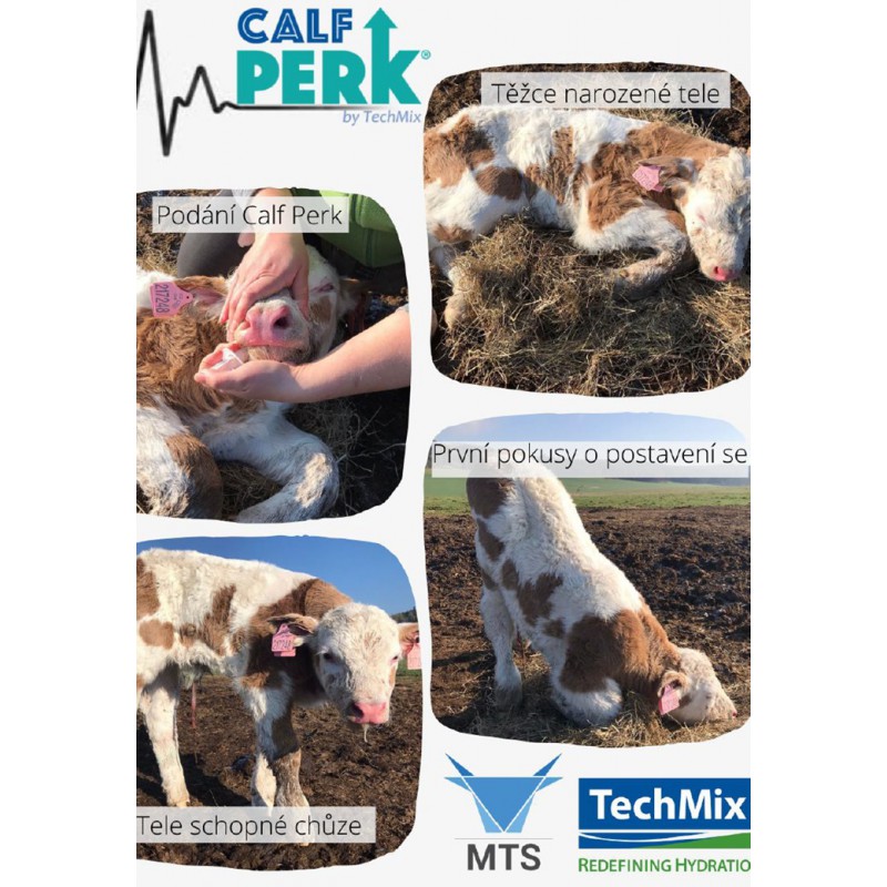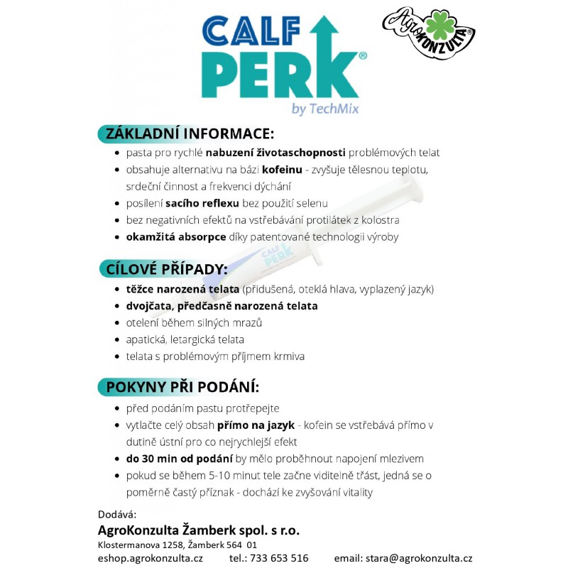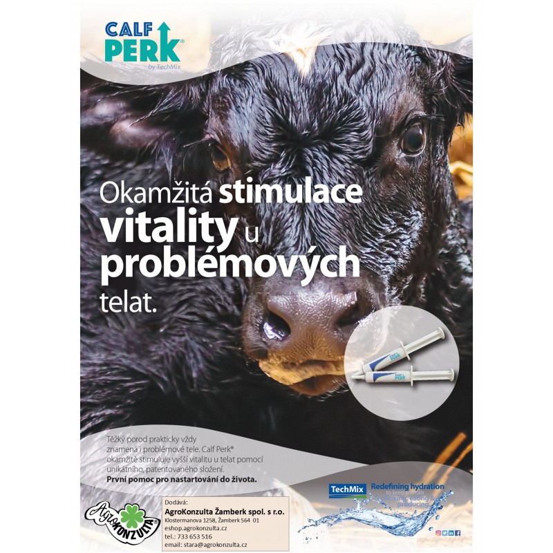 Calf Perk® je ve formě pasty velice jednoduchý na podání a poskytuje telatům okamžitý energetický stimulant, který přirozeně zvyšuje tělesnou teplotu a dechovou frekvenci. Obsažené efektivní látky přírodního původu na bázi kofeinu mají stejný efekt, který známe sami z každodenního života. Jak se ráno cítíte před prvním šálkem kávy? Calf Perk® má zkrátka má za cíl telata co nejdříve postavit na nohy a doslova nastartovat do života.